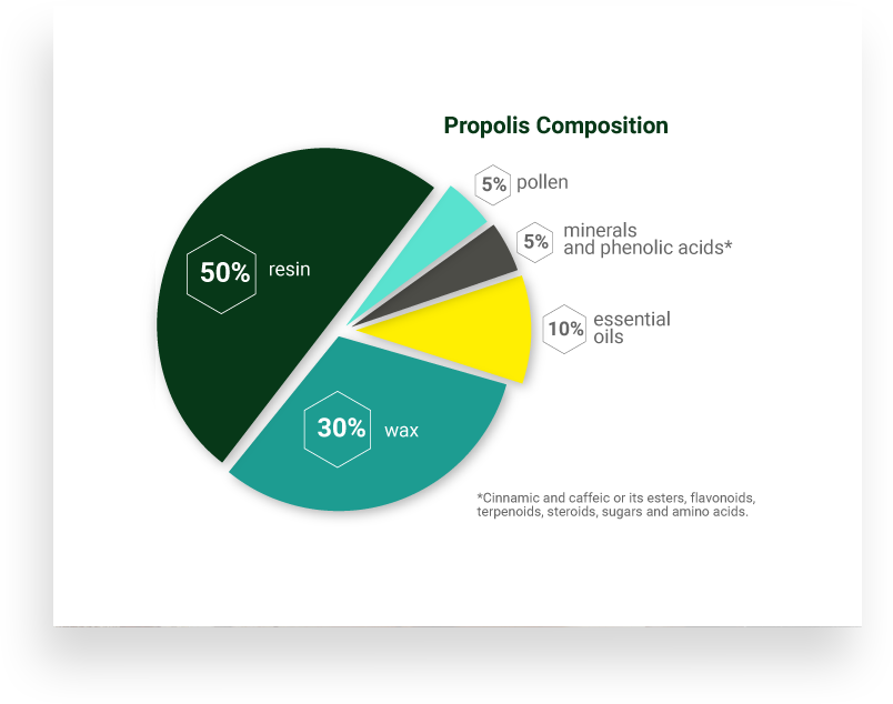 In fact, bees use propolis production to protect their hive against the invasion of microorganisms (bacteria, fungi and virus) and other insects, to repair openings and embalm invaders or even dead bees inside their setting. Propolis is a resinous and balsamic substance formed by a complex set of chemical substances collected by bees from the region’s vegetation. This is why they are called “pharmaceutics with wings”. Different ways of preparation have been used throughout centuries in popular medicine due to its therapeutics properties.